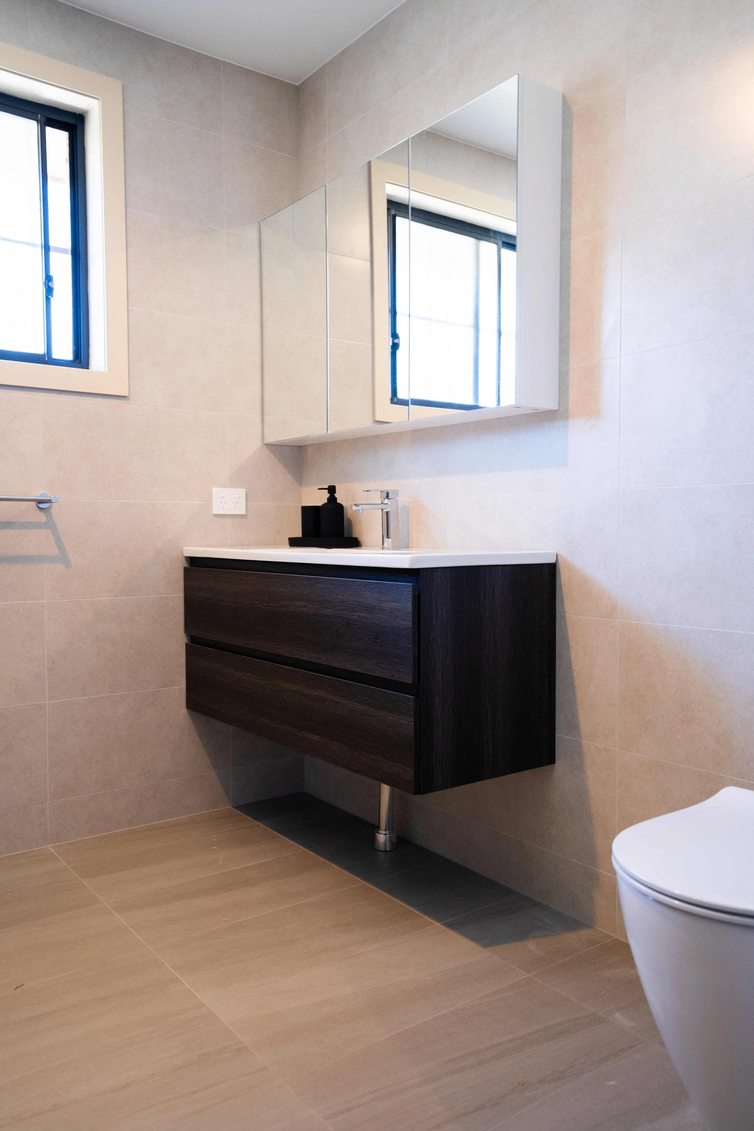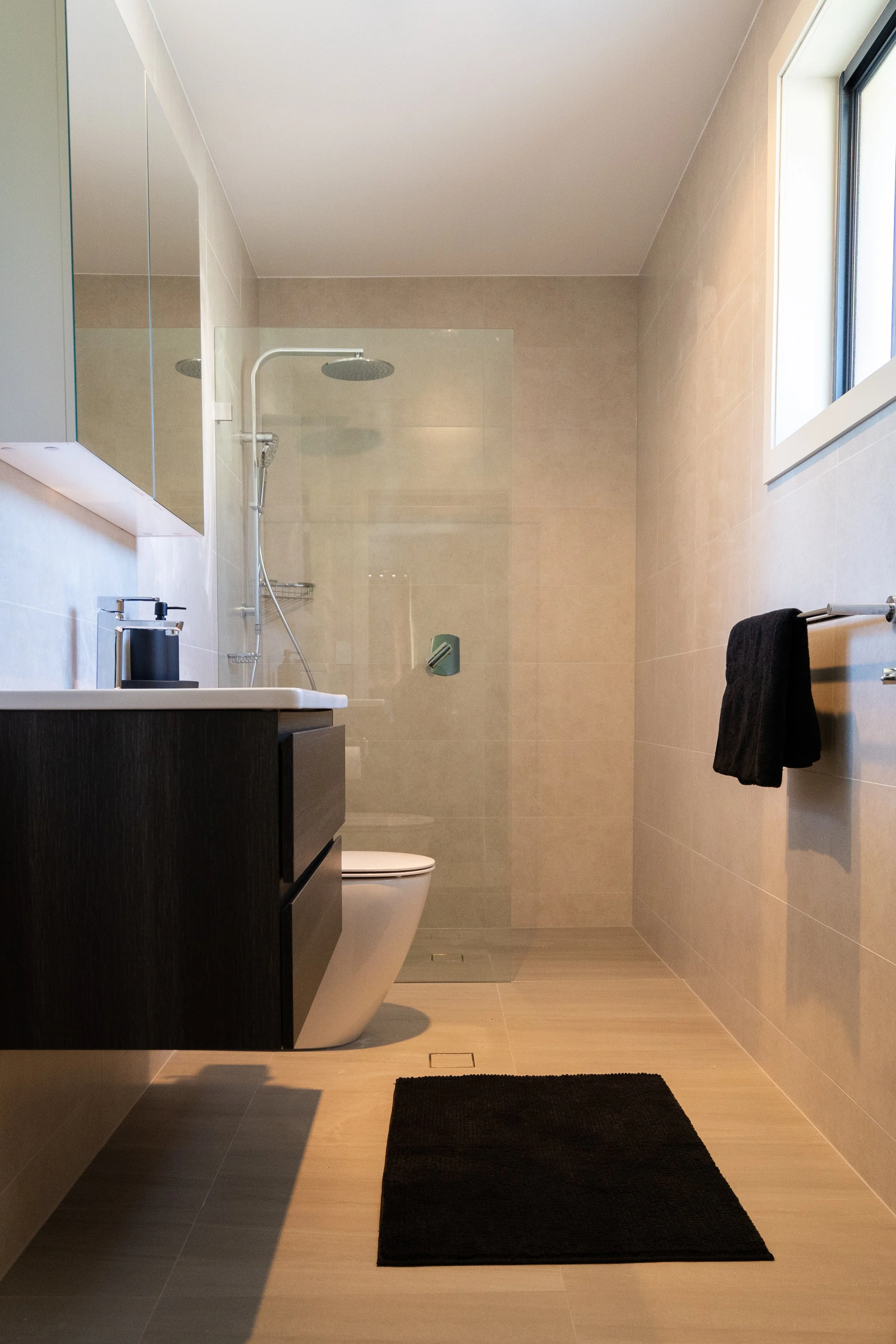 In our recent project in Canterbury, we transformed two bathrooms into stunning, harmonious spaces that resonate with modern luxury. With a focus on sophisticated design, we curated stylish black cabinetry and accents, creating statement features that elevate the entire home's aesthetic.
